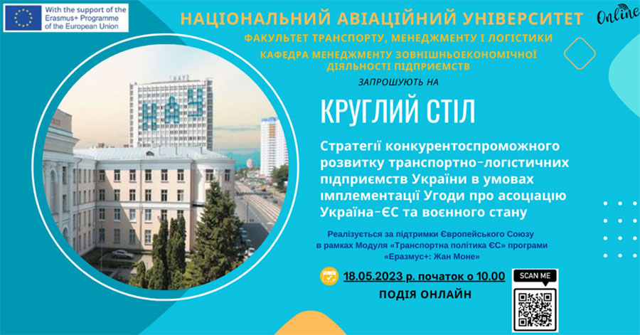 18 травня 2023 р. Національний авіаційний університет запрошує фахівців та вчених, представників бізнесу та науковців, студентів та усіх осіб, зацікавлених у пошуку ефективних напрямів розвитку транспорту та логістики України на принципах європейської інтеграції в умовах воєнного стану, долучитися до круглого столу «Стратегії конкурентоспроможного розвитку транспортно-логістичних підприємств України в умовах імплементації Угоди про асоціацію Україна-ЄС та воєнного стану». Захід відбудеться в межах реалізації проєкту Програми Європейського Союзу Еразмус+ Жан Моне «Транспортна політика ЄС».