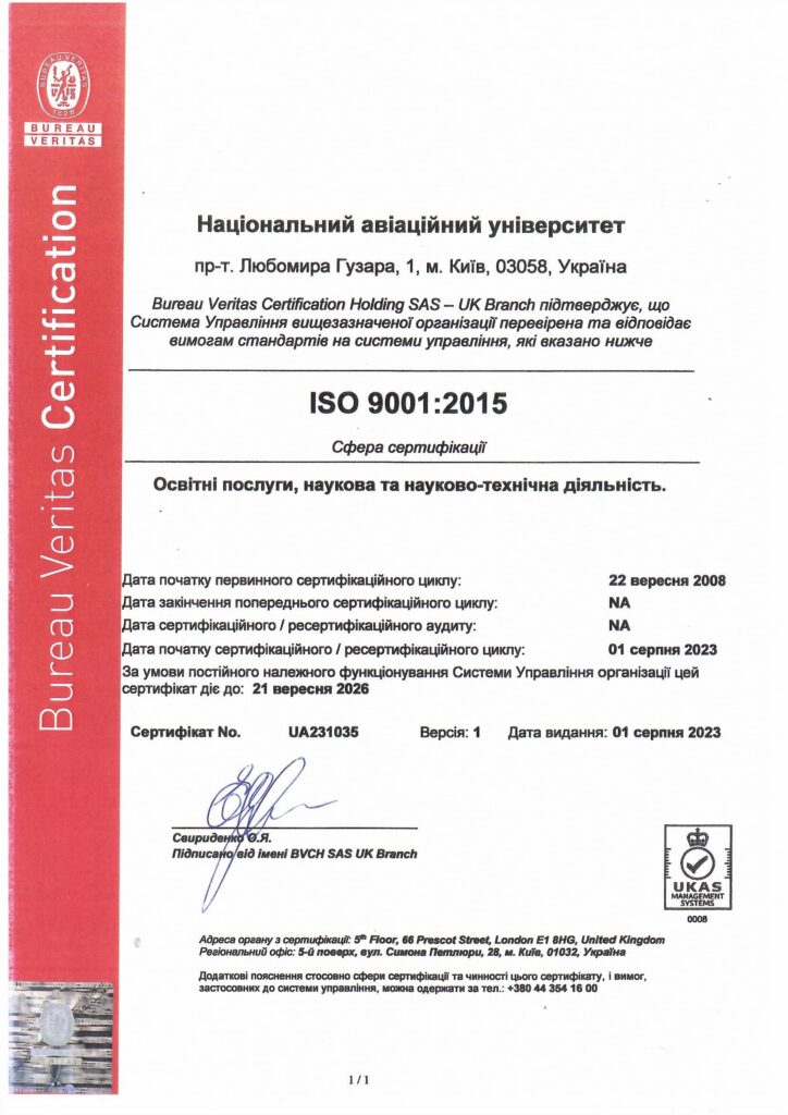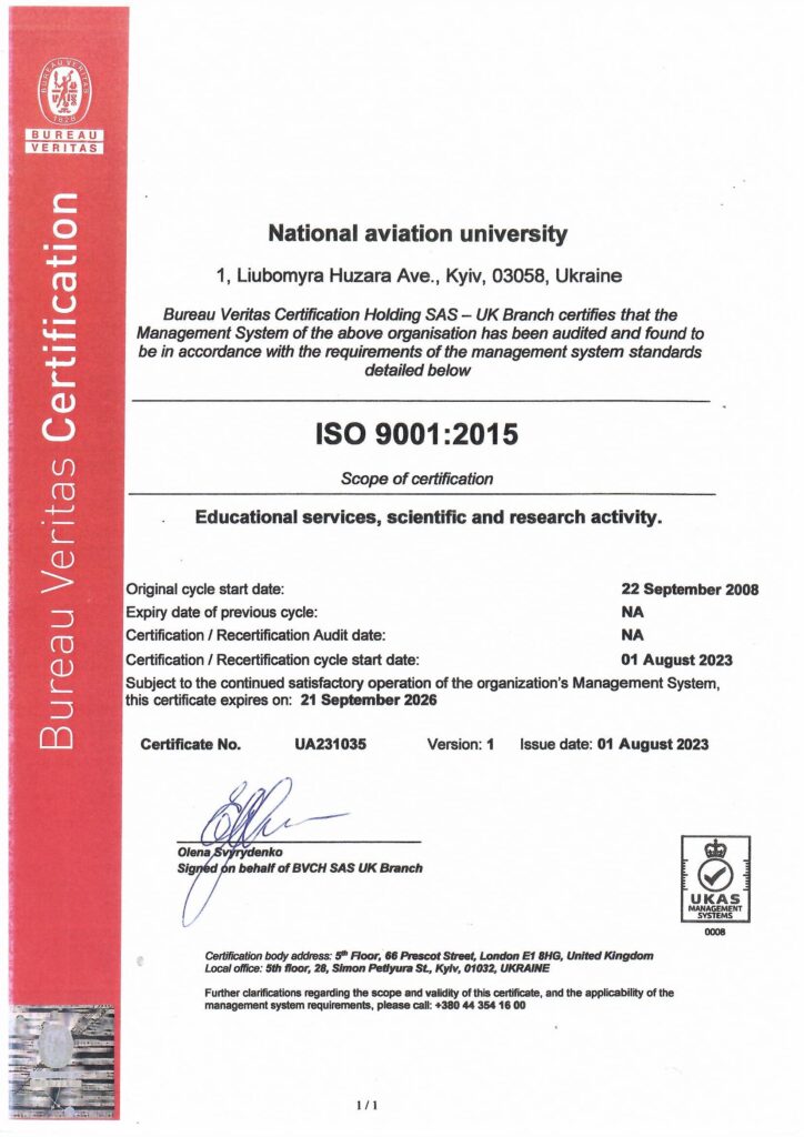 Кафедра менеджменту зовнішньоекономічної діяльності підприємств Факультету транспорту, менеджменту і логістики успішно пройшла ре-сертифікаційний аудит системи управління якістю на відповідність стандарту ISO 9001:2015, який проводило ТОВ «Бюро Верітас Сертифікейшн Україна» в Національному авіаційному університеті.