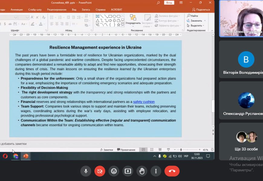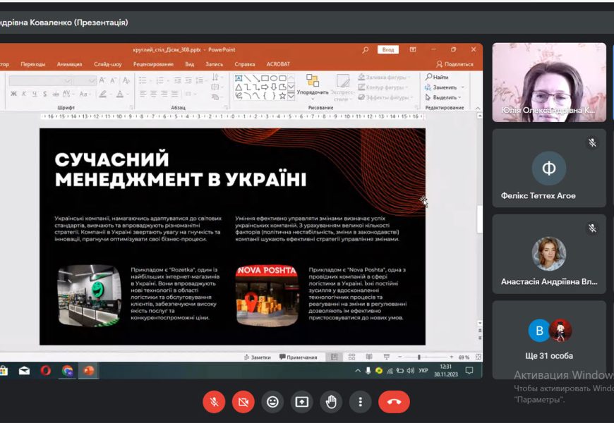 30 листопада 2023 року кафедрою менеджменту зовнішньоекономічної діяльності підприємств було проведено круглий стіл на тему: “Сучасний менеджмент: досвід країн ЄС та України”. В круглому столі взяли участь викладачі кафедри та здобувачі вищої освіти 2-5 курсів, які підготували цікаві та змістовні доповіді.
