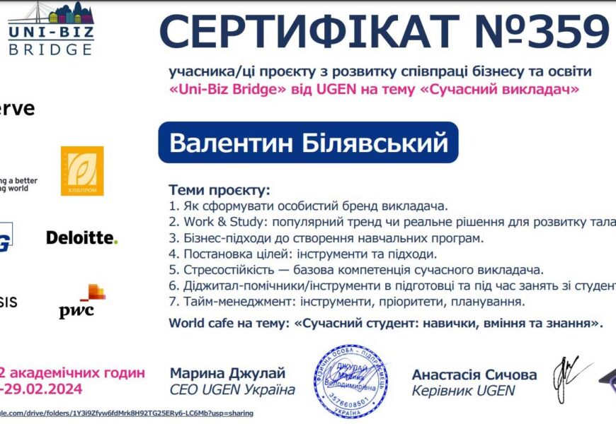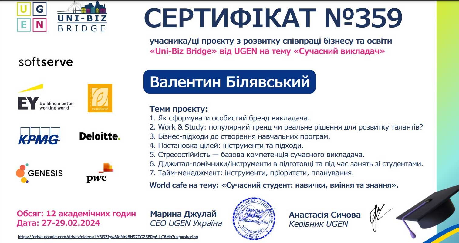 Доцент кафедри менеджменту зовнішньоекономічної діяльності підприємств, к.е.н. Білявський Валентин Миколайович став учасником проєкту з розвитку співпраці бізнесу та освіти “Uni-Biz Bridge” від UGEN на тему “Сучасний викладач”.