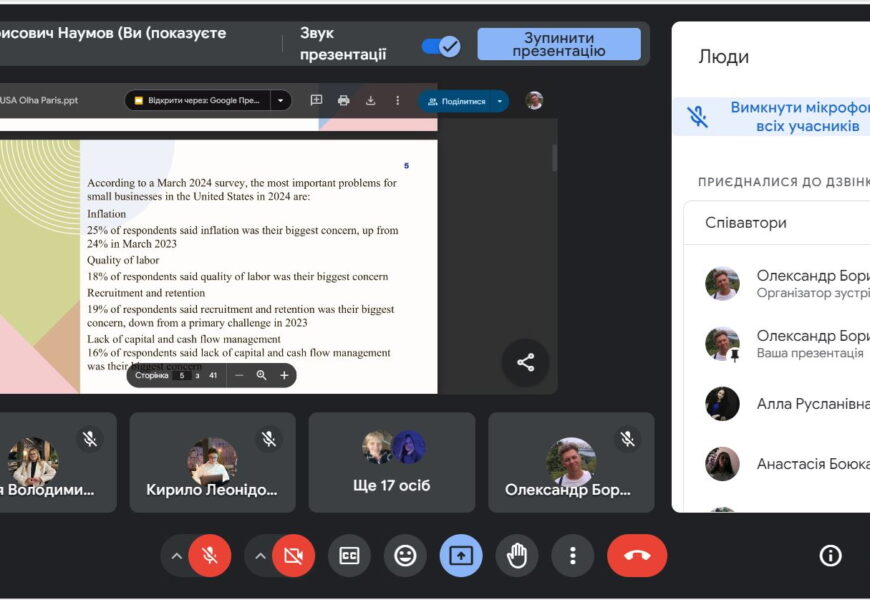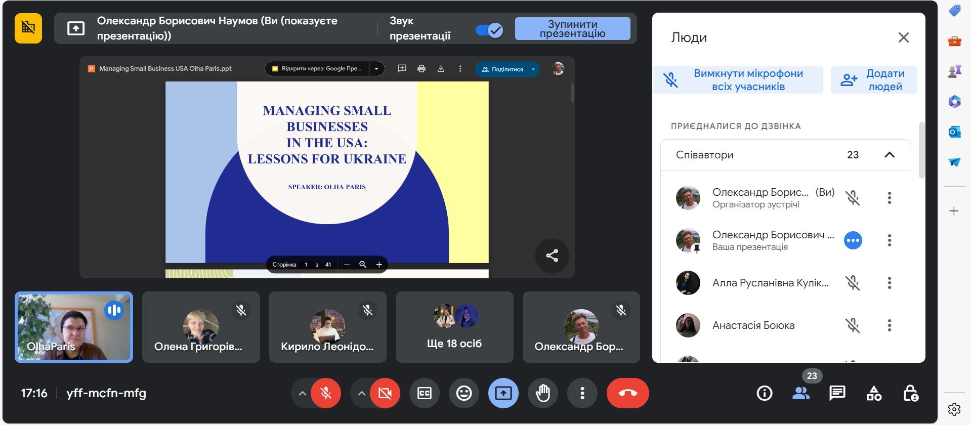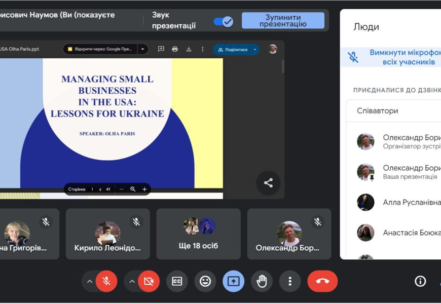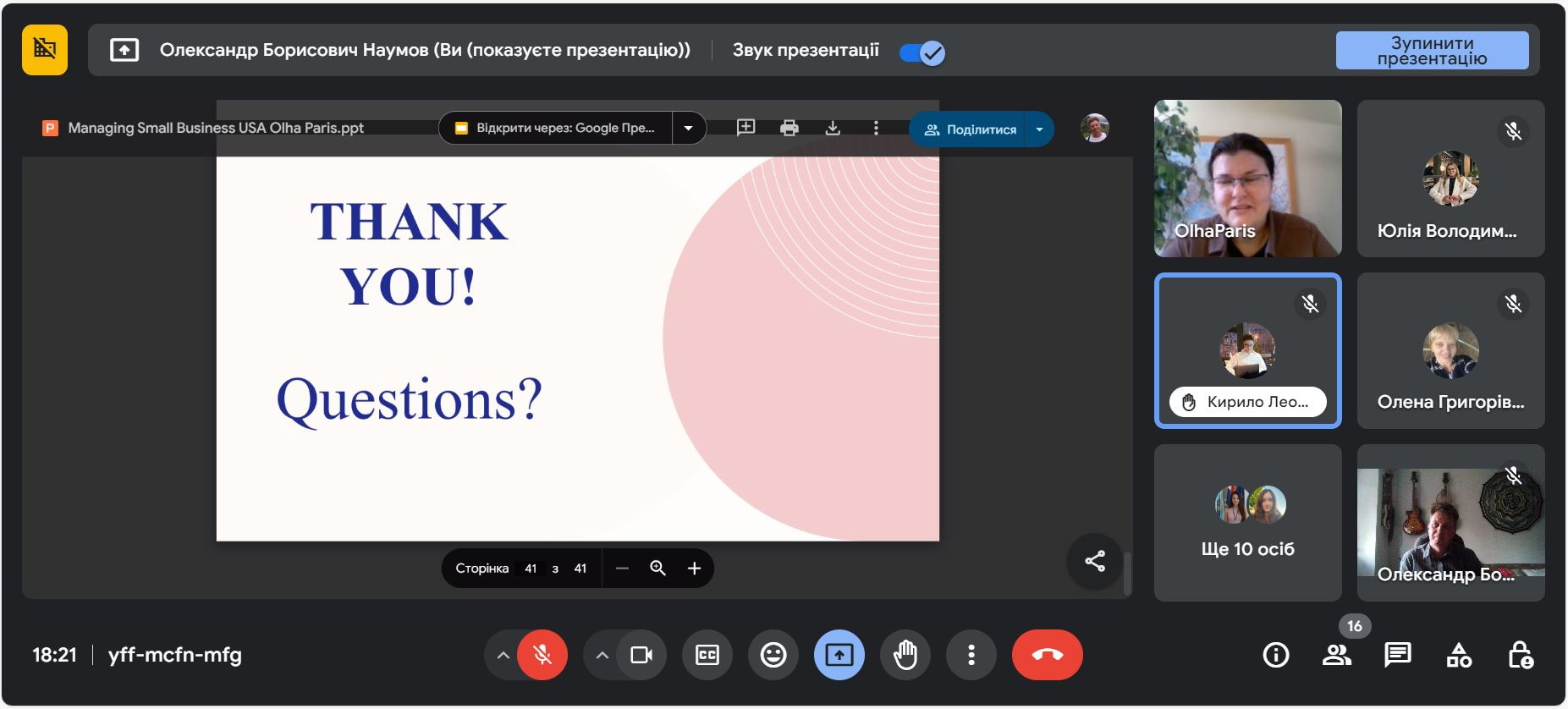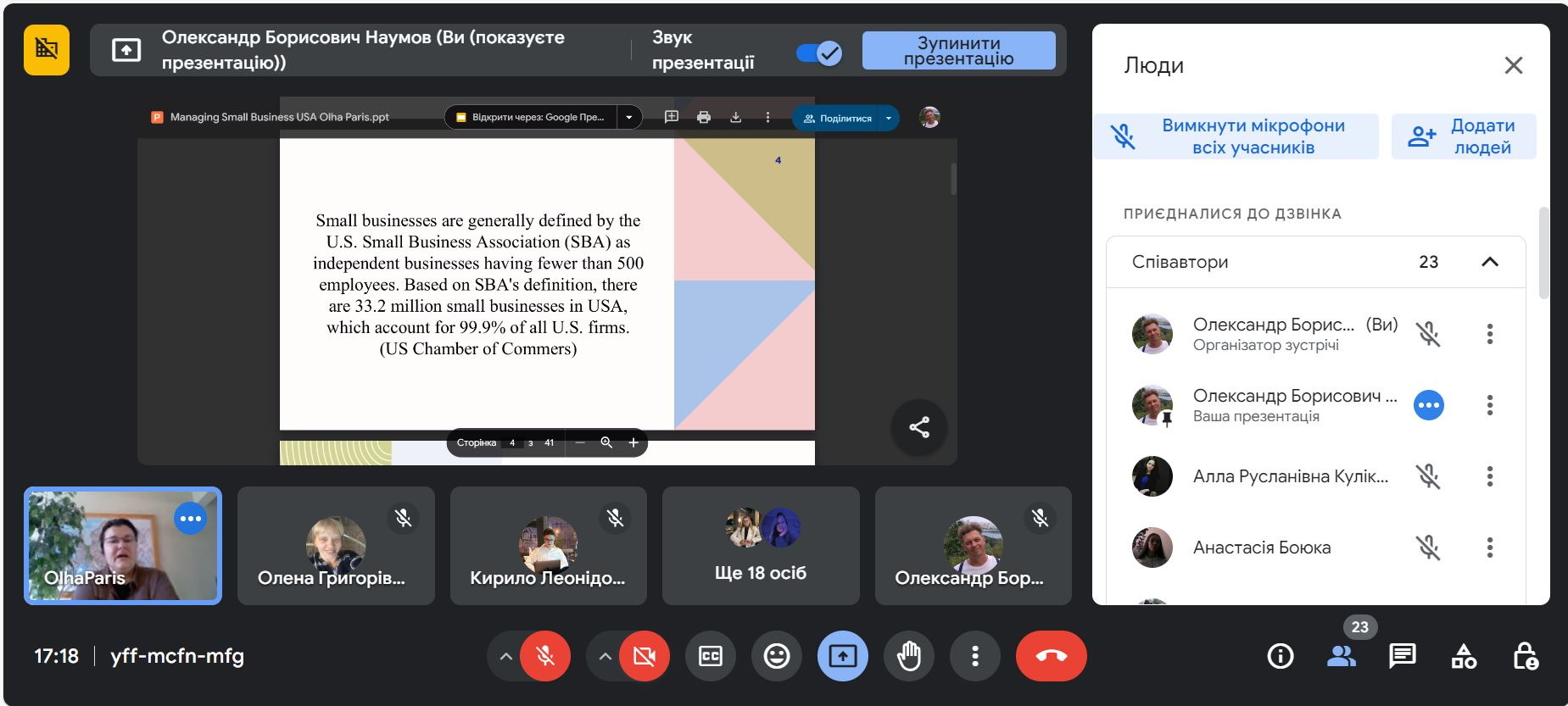 16 травня 2024 року кафедрою менеджменту зовнішньоекономічної діяльності підприємств ФТМЛ НАУ було проведено вебінар на тему: “Управління малим бізнесом в США: Уроки для України”. Спікером вебінару була Olga Paris (Ольга Періс), кандидат економічних наук, доцент, приватний підприємець (CША).