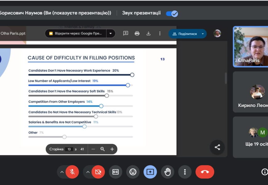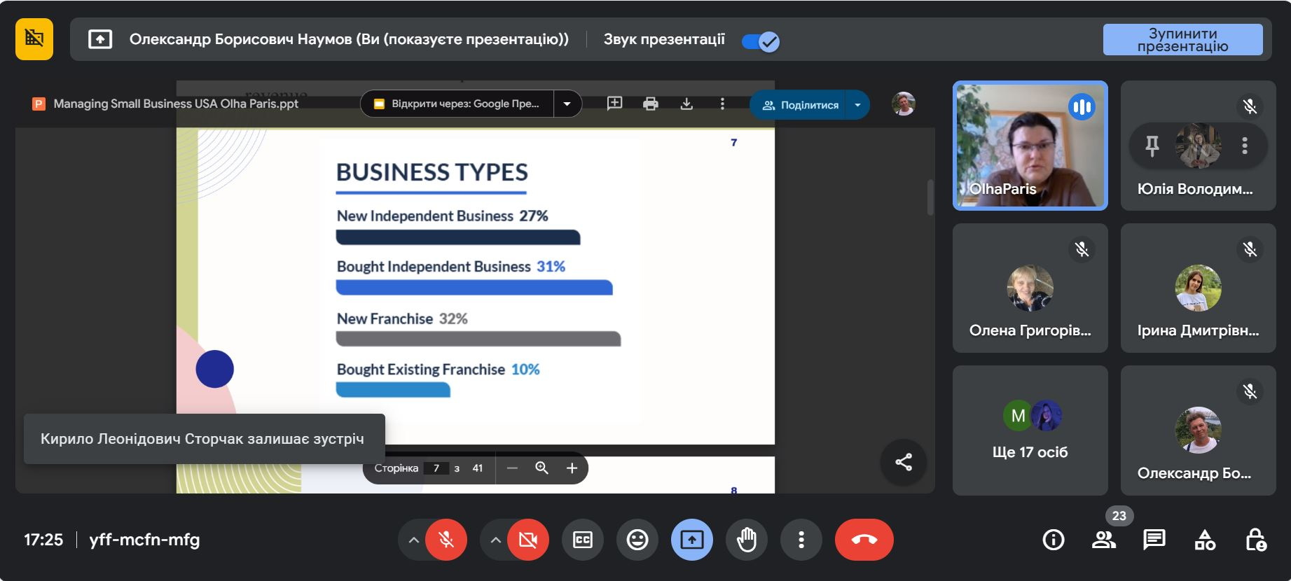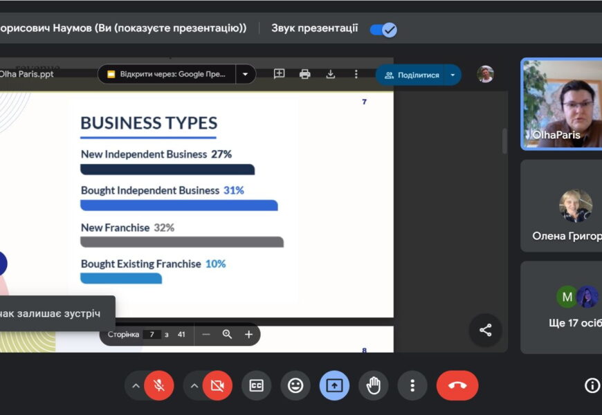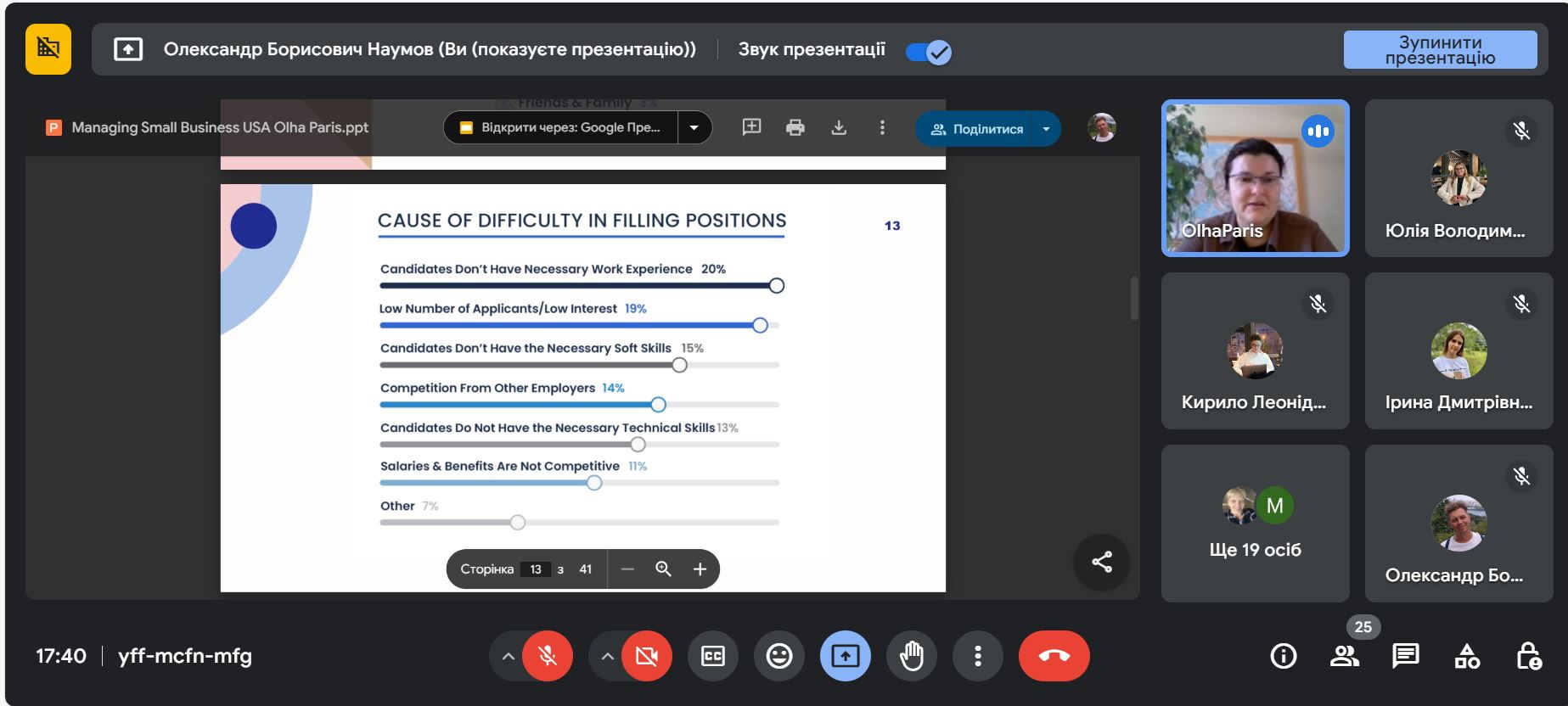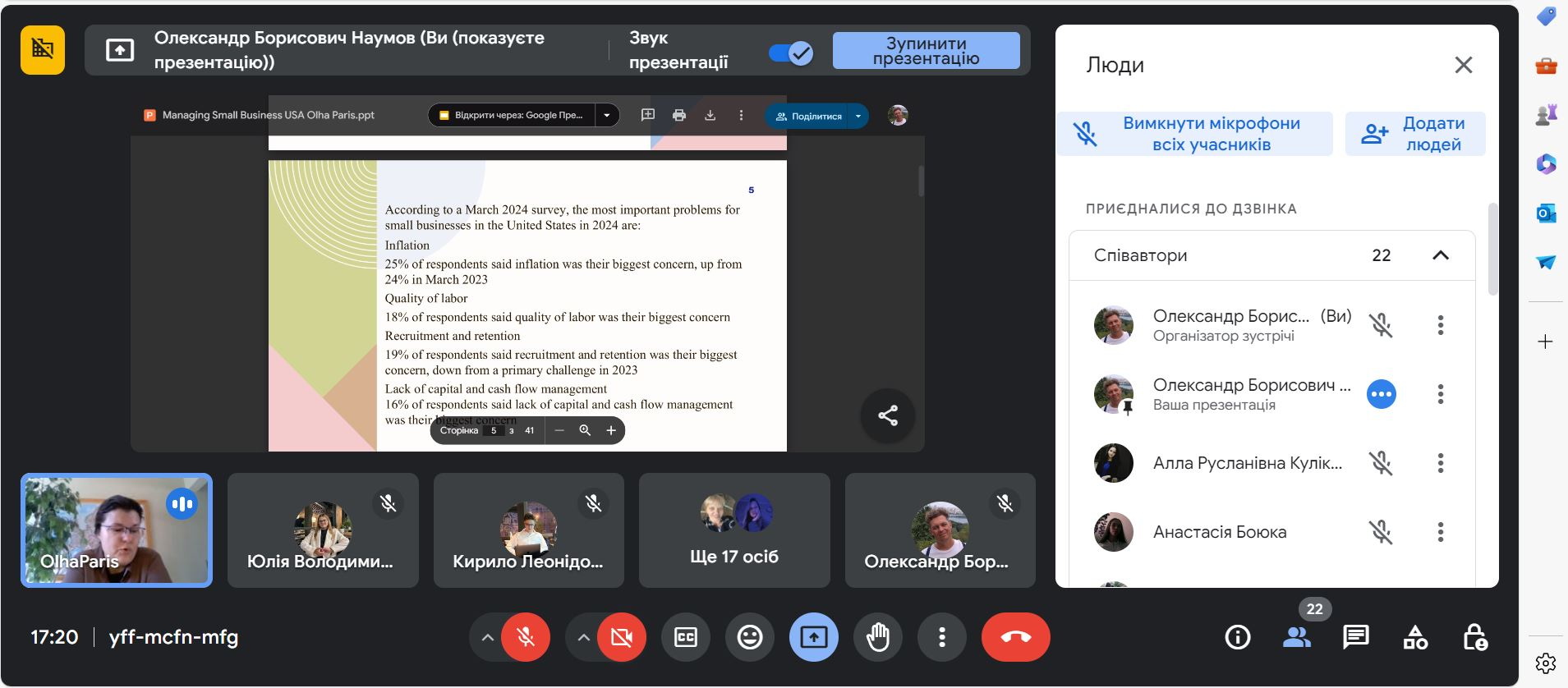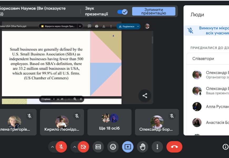 16 травня 2024 року кафедрою менеджменту зовнішньоекономічної діяльності підприємств ФТМЛ НАУ було проведено вебінар на тему: “Управління малим бізнесом в США: Уроки для України”. Спікером вебінару була Olga Paris (Ольга Періс), кандидат економічних наук, доцент, приватний підприємець (CША).