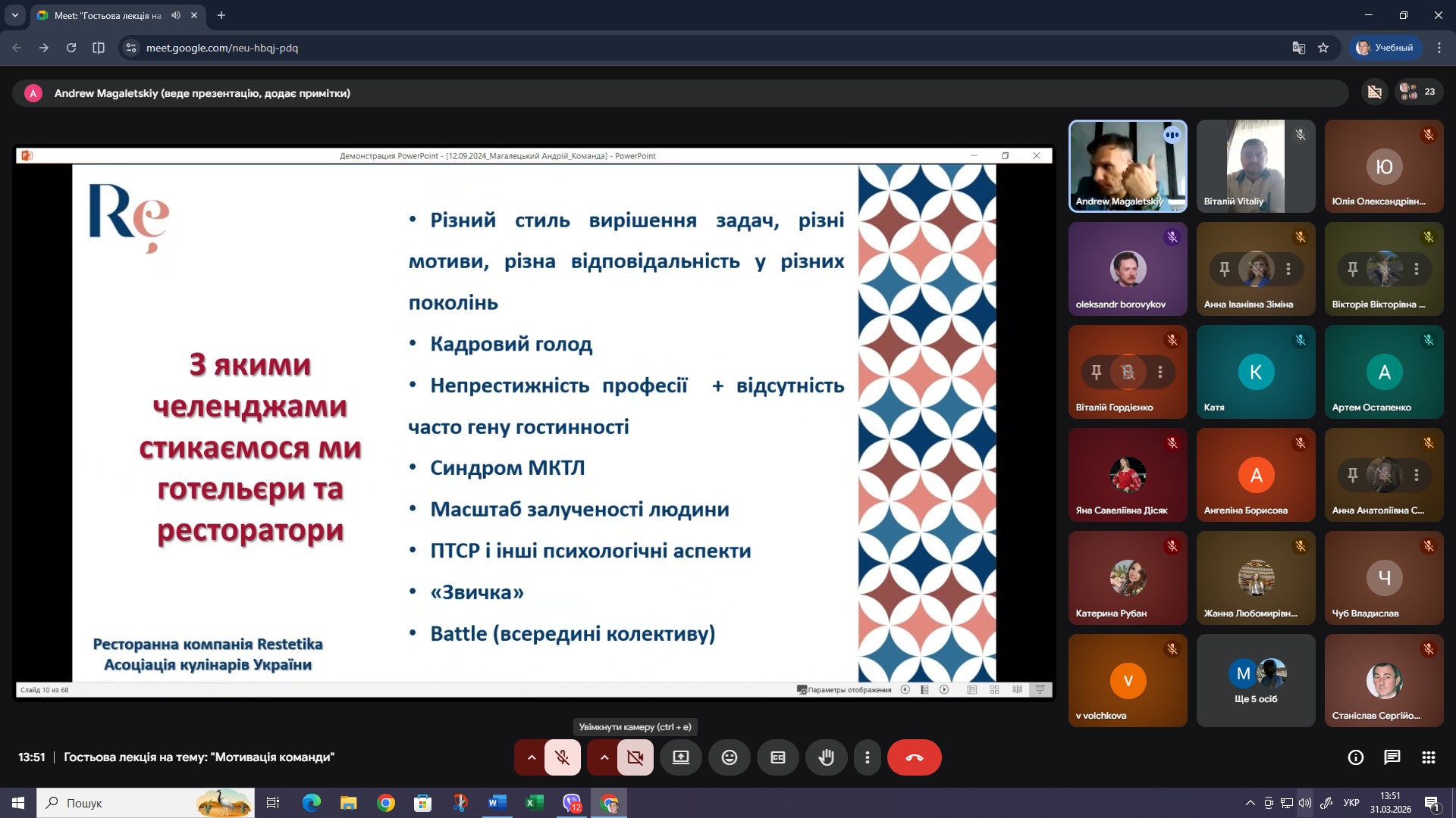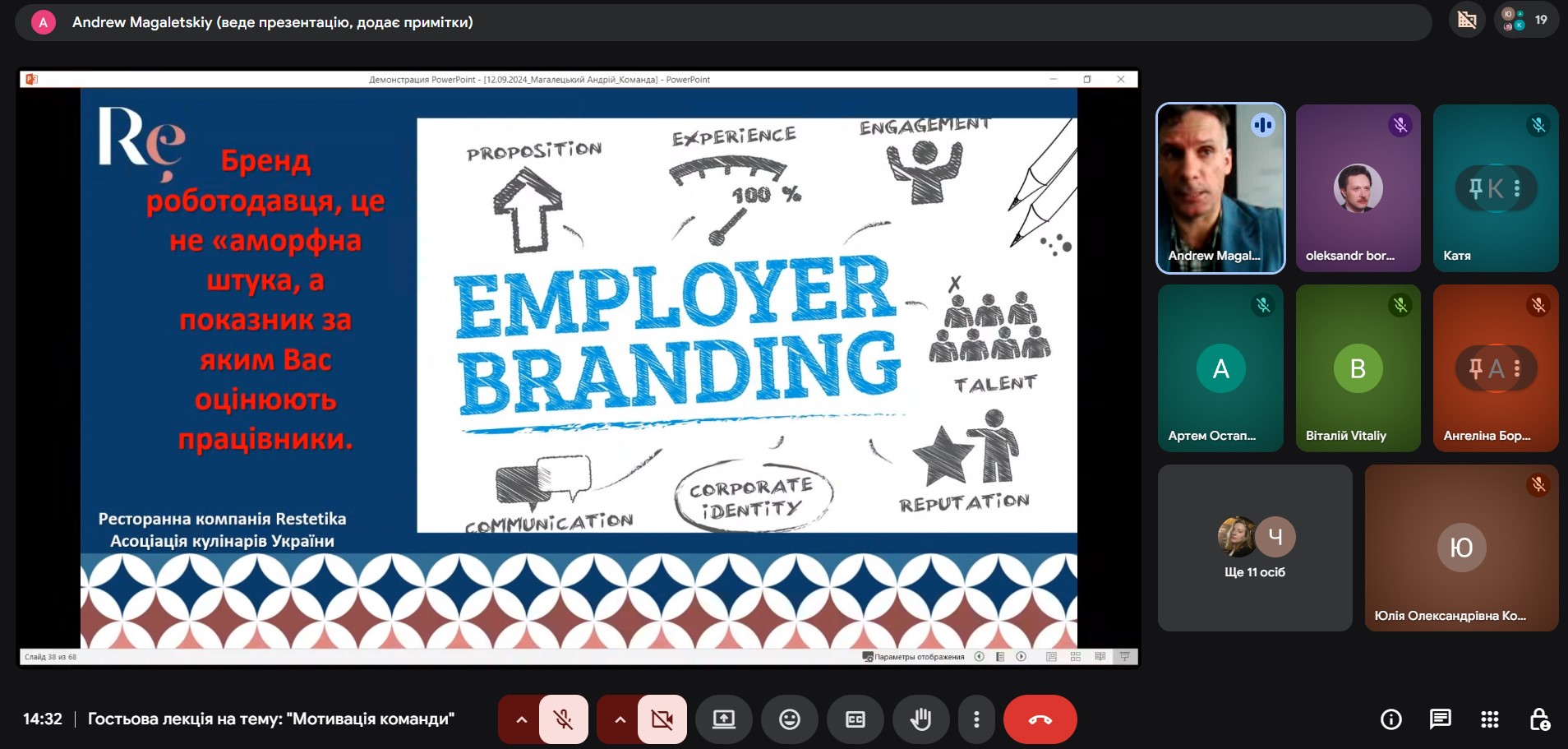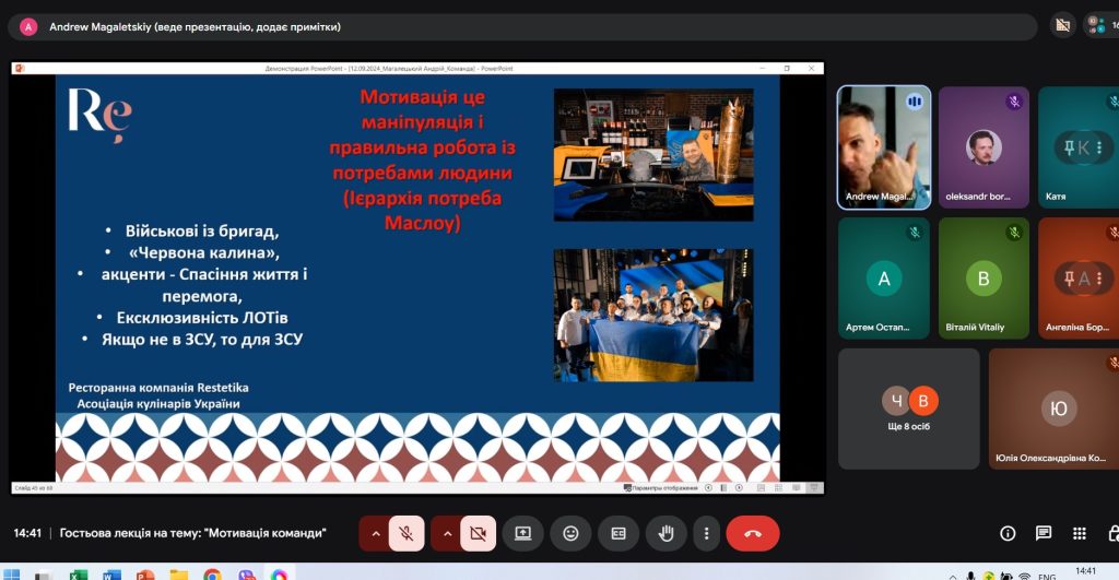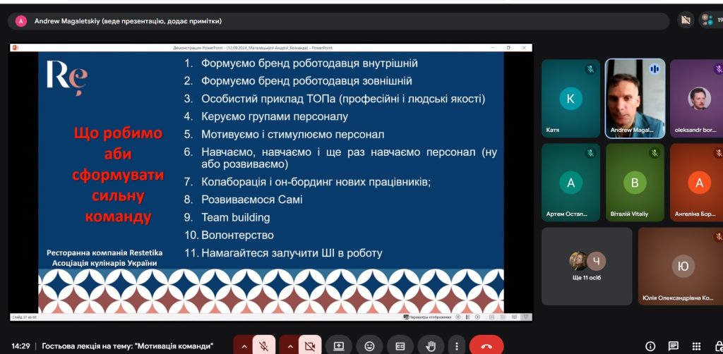 В ході цікавої зустрічі спікер поділився власним досвідом формування та мотивації команд та як зробити свою команду сильною, розповів про основні челенджі, з якими стикаються готельєри та ресторатори в управлінні командою, про те, як покращувати імідж роботодавця, як піклуватися про моральний стан працівників і як правильно мотивувати свою команду, навів приклади використання ШІ в ресторанному бізнесі.