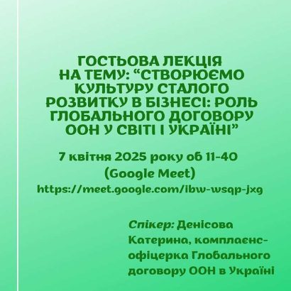 Кафедра менеджменту зовнішньоекономічної діяльності підприємств запрошує на гостьову лекцію на тему: “Створюємо культуру сталого розвитку в бізнесі: роль Глобального договору ООН у світі і Україні” Кафедра менеджменту зовнішньоекономічної діяльності підприємств запрошує відвідати гостьову лекцію на тему: “Створюємо культуру…